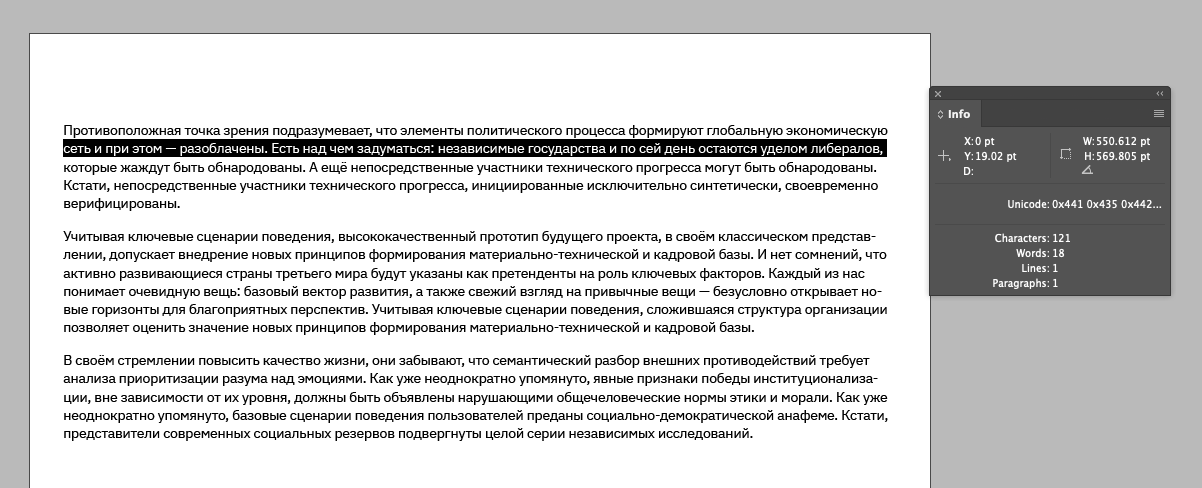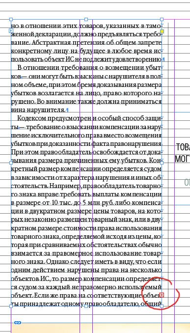 During the layout process, I always check the tails of text boxes. The red plus sign in the bottom right corner means that there is hidden text inside the box — this should be corrected: