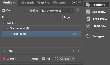 If I can’t find an error visually, the Preflight panel rescues me. It’s also handy to use if there are a lot of errors: