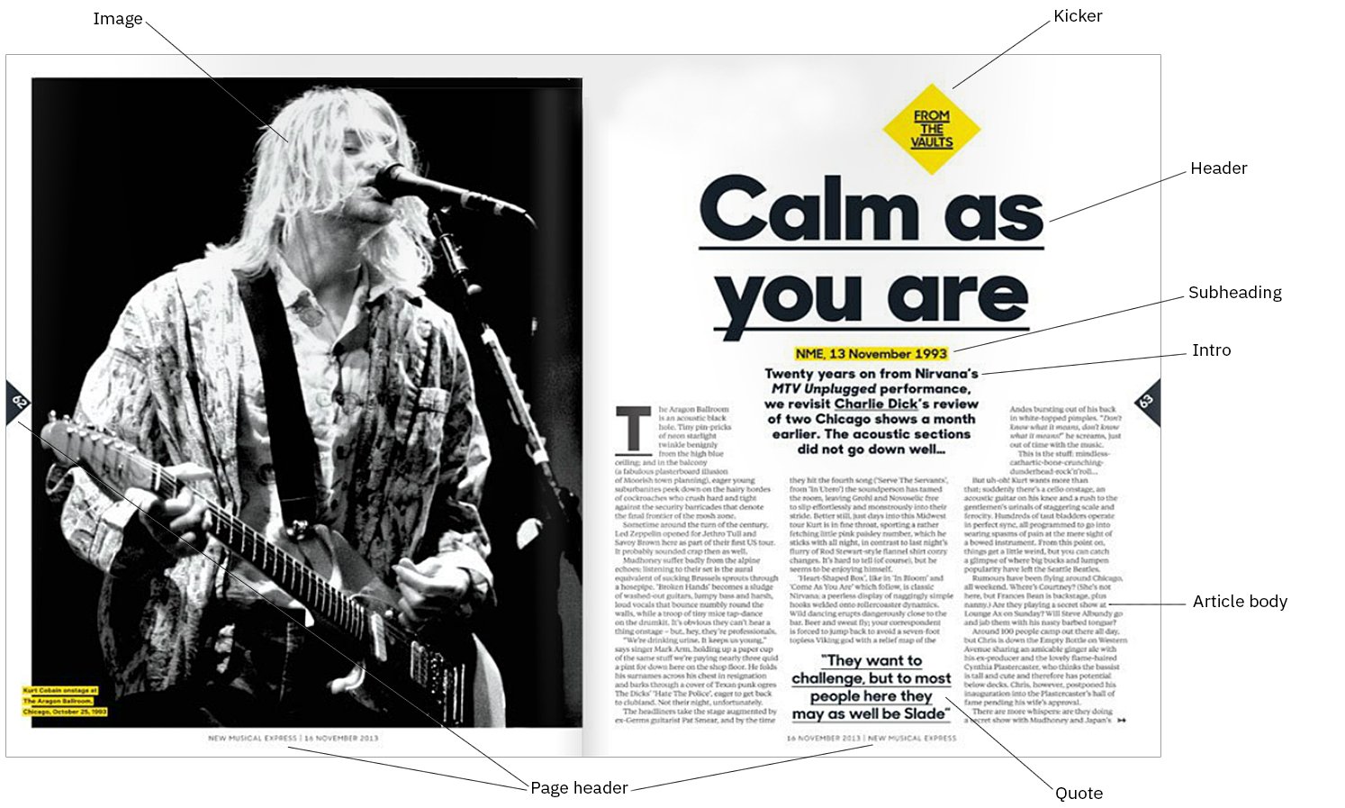 Today I will talk about the elements found in a magazine spread. Three main elements in the centrefold influence the reader’s attention: the image, the composition of the layout, and the headline. In addition, there may be a kicker, an intro, an author line, an article body and, of course, a header. Let’s look at each of these elements in more detail.