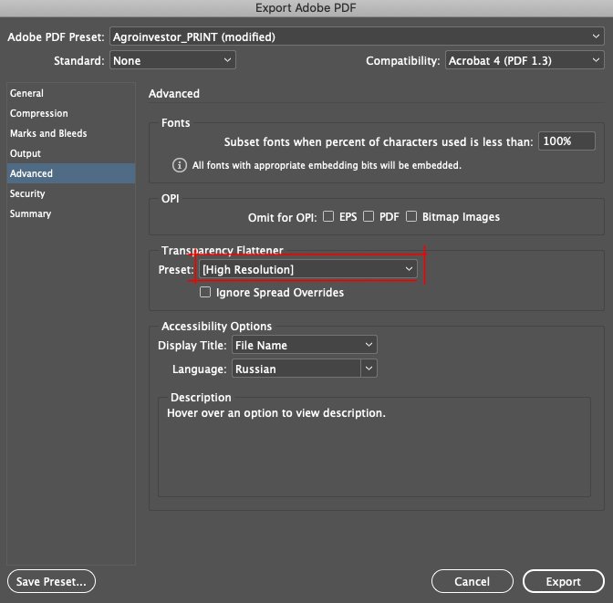 This is how to create a preset with the right settings and use it when exporting. I know that “Agroinvestor” magazine has no transparency in its layout, so I don’t bother with the preset but use the built-in High Resolution preset: