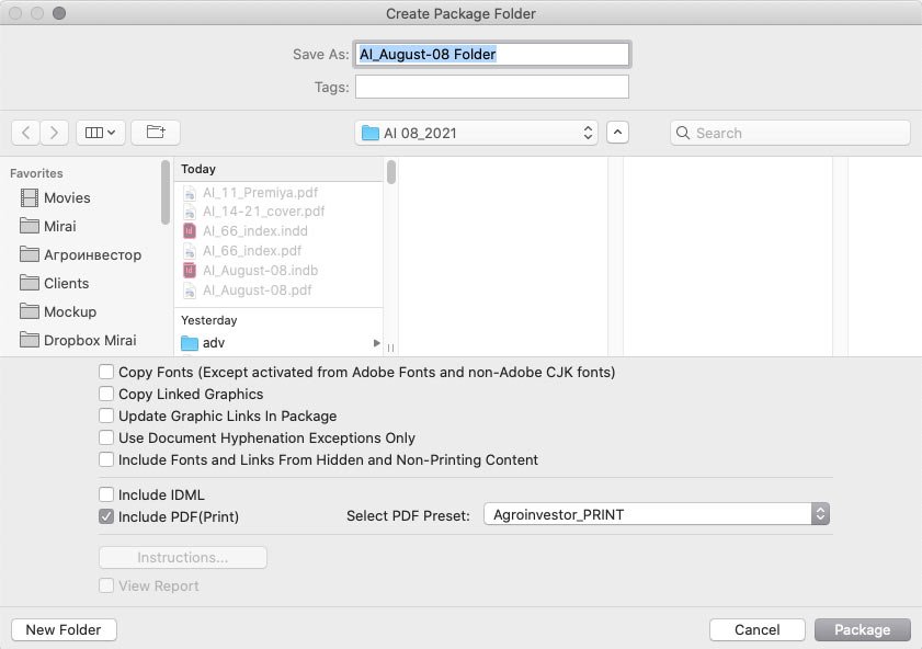 I use the Book format in InDesign in my periodical work (I’ll talk about it in a separate post), so I use the Package Book For Print command to export the file to print. A window pops up where I can tick all the checkboxes I want to get into the export package — I only want the PDF file, and I also select a pre-saved export preset for Agroinvestor: