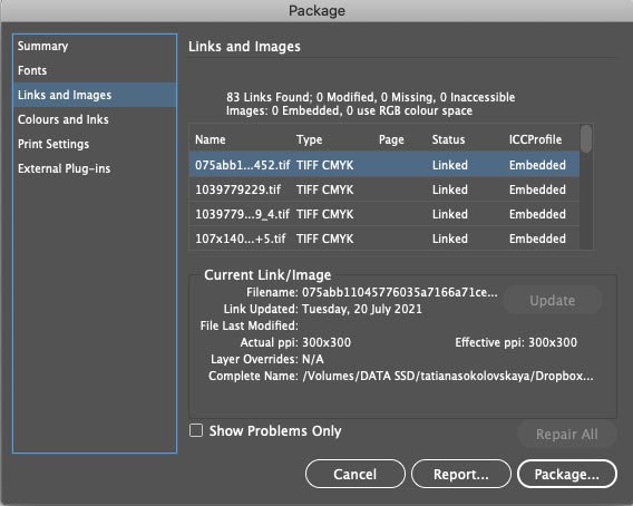 When all the images are ready, I go to Indesign and replace all the images with those in the TIF CMYK folder. At this stage, I review each image, and if I don’t like something, I can always go back to any stage of its processing and correct it. That’s why I save files separately in additional folders.