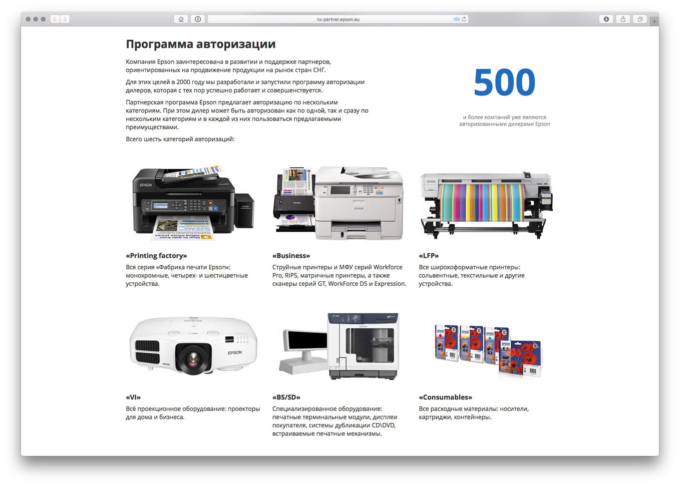 Assembling the first “floor”. I show the authorisation categories for which companies become partners visually in the form of photos of devices in this category. Here I also decide to add social proof in the form of a factoid: 500 companies have already become Epson partners.