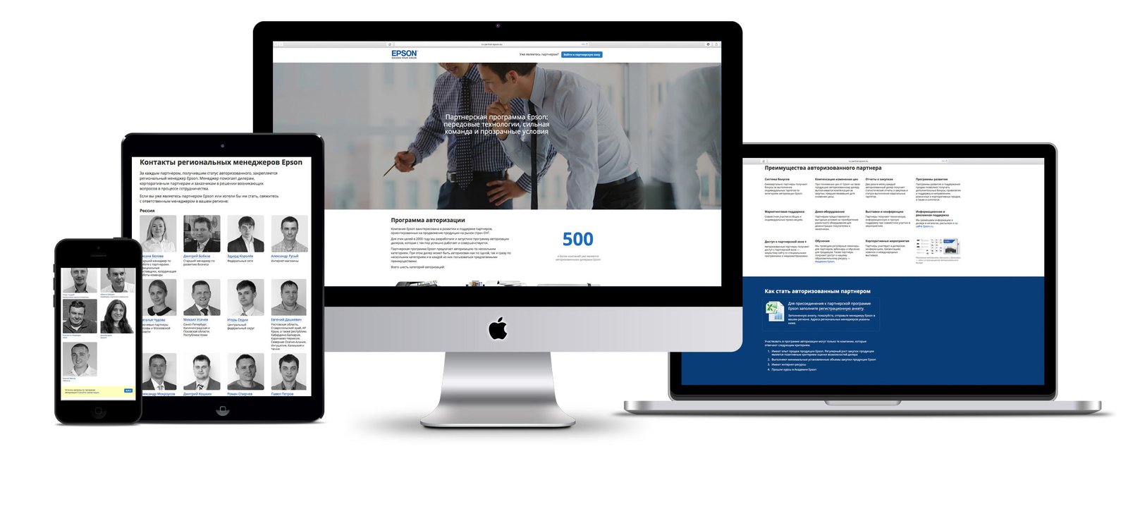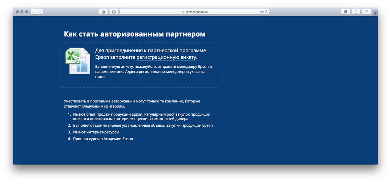 Epson is a Japanese manufacturer of equipment and a world leader in projection equipment and printing technology. For the company’s Moscow representative office, the client’s team and I made a website with a story about the partner programme.