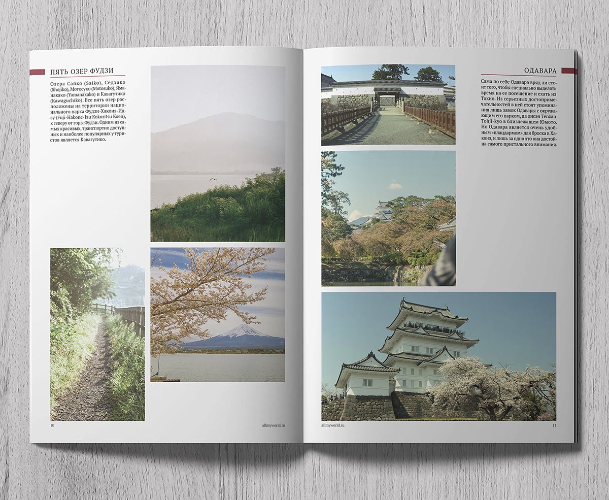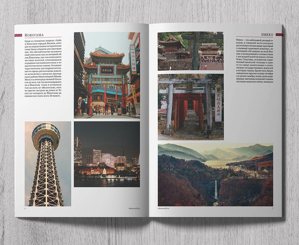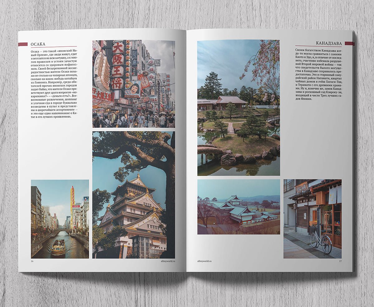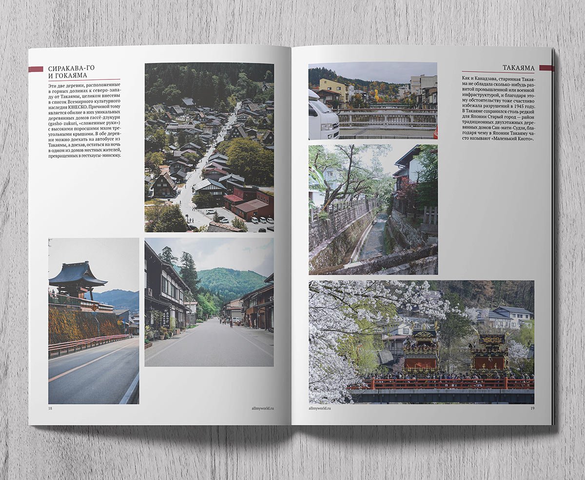 The guidebook has a rather formulaic material — a paragraph of text and three photos to it. I placed the text blocks on the edges of the pages so that you can quickly flip through the pages to find the city you are looking for. I made three different layouts for the photos on the spreads, and they alternate, which creates a kind of rhythm.