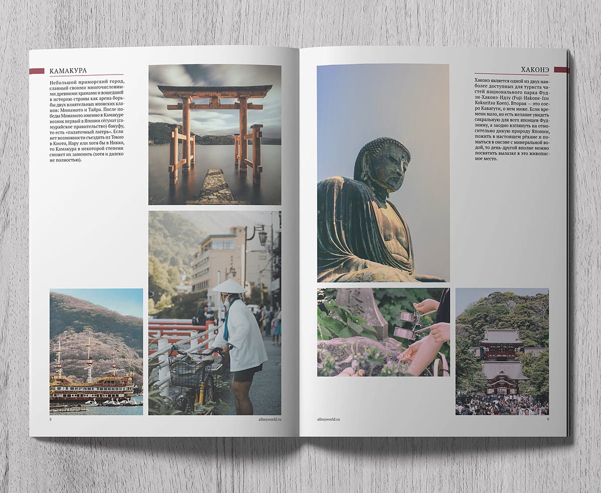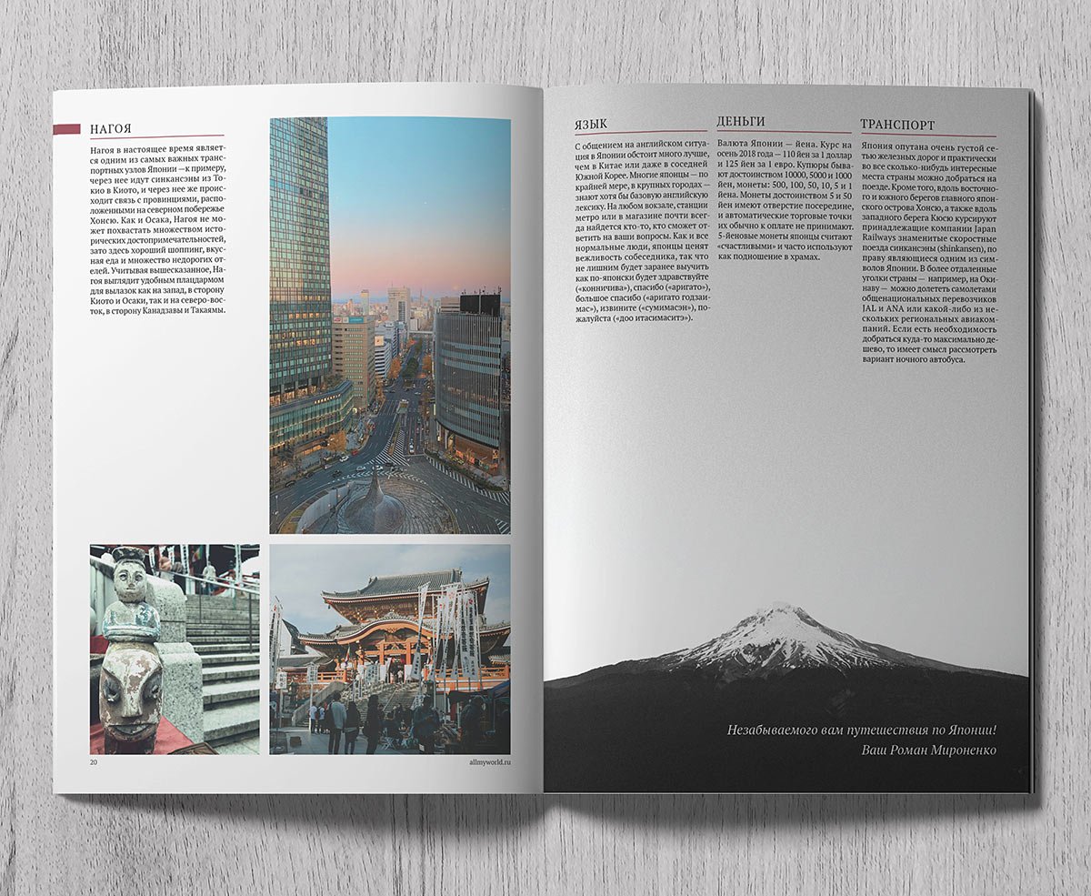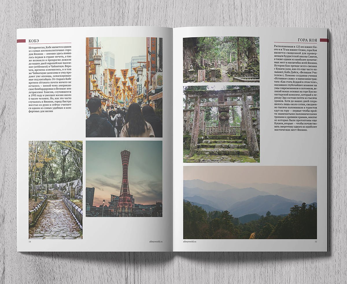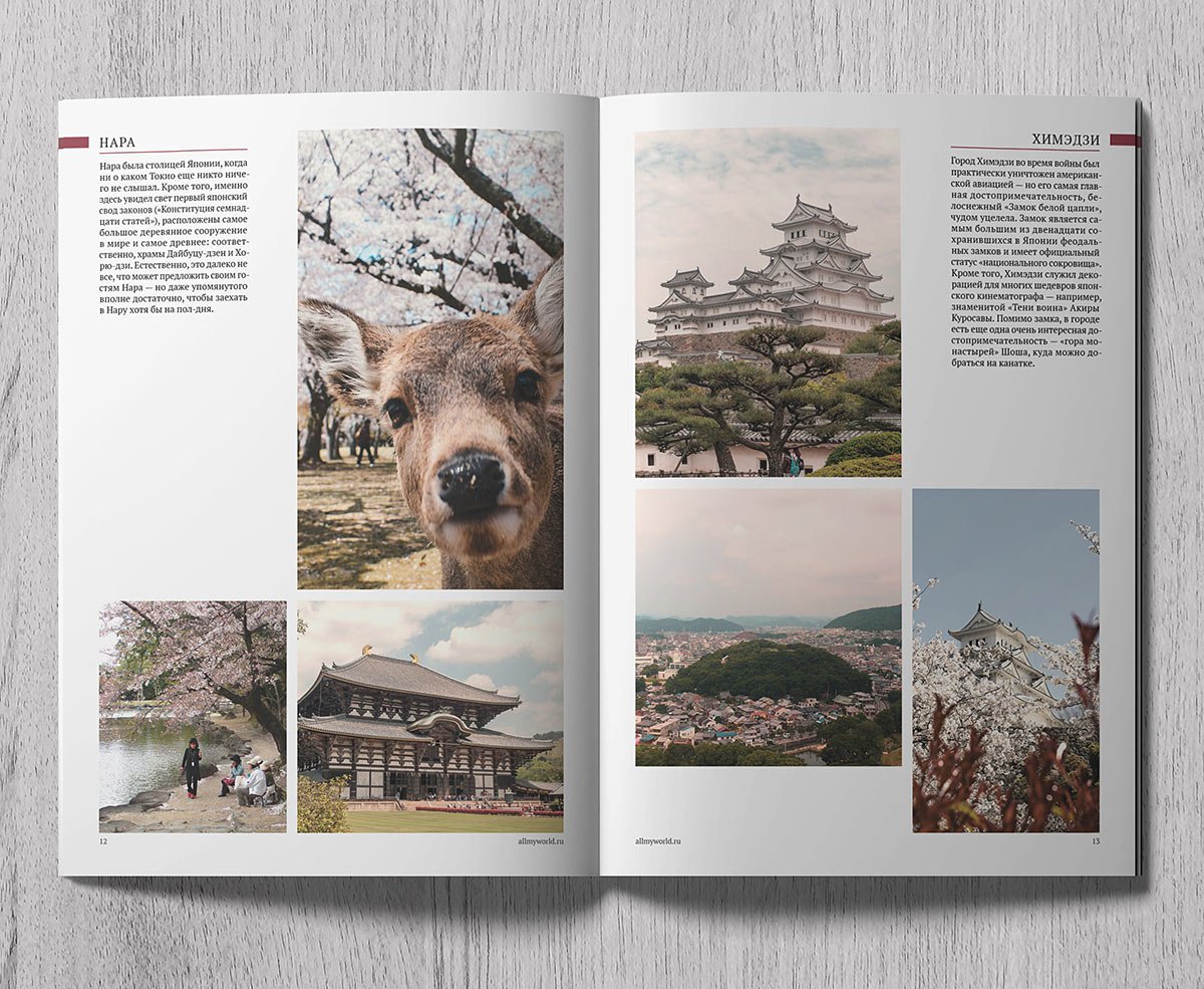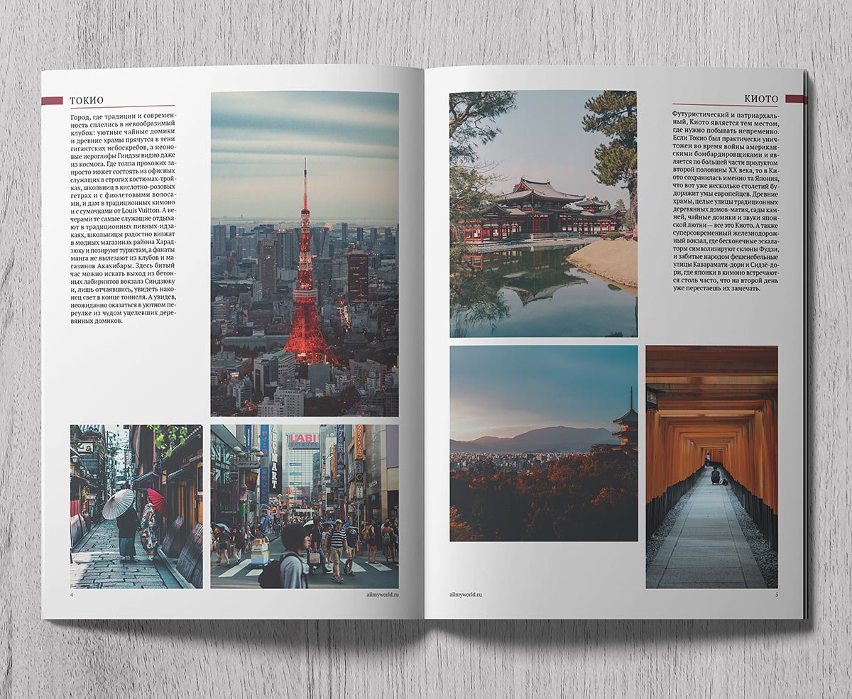 The guidebook has a rather formulaic material — a paragraph of text and three photos to it. I placed the text blocks on the edges of the pages so that you can quickly flip through the pages to find the city you are looking for. I made three different layouts for the photos on the spreads, and they alternate, which creates a kind of rhythm.