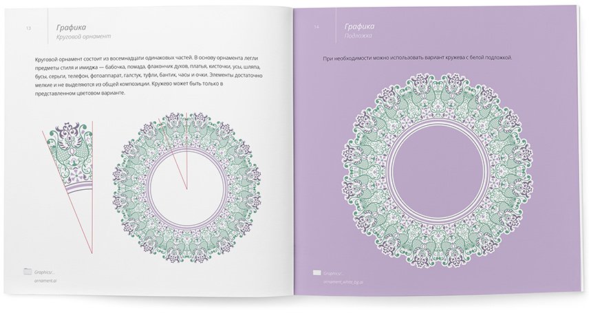 Lace ornament became an element of the corporate style. At first glance, it seems ordinary, but there is a zest in it — looking at the pattern, one can see various elements of the style: tie, dresses, glasses, beads, hats, perfume bottles, lipstick and many others.