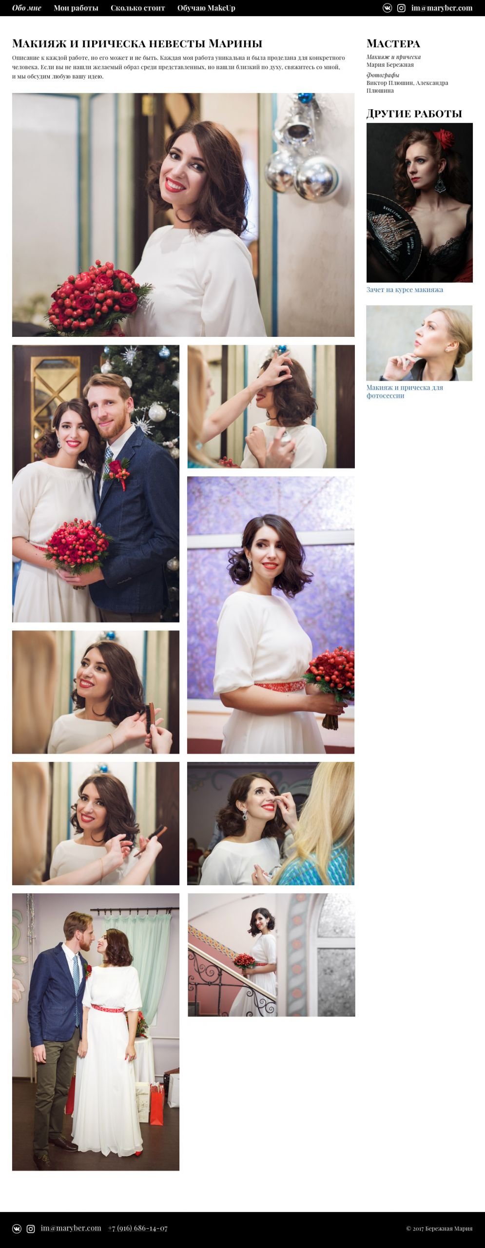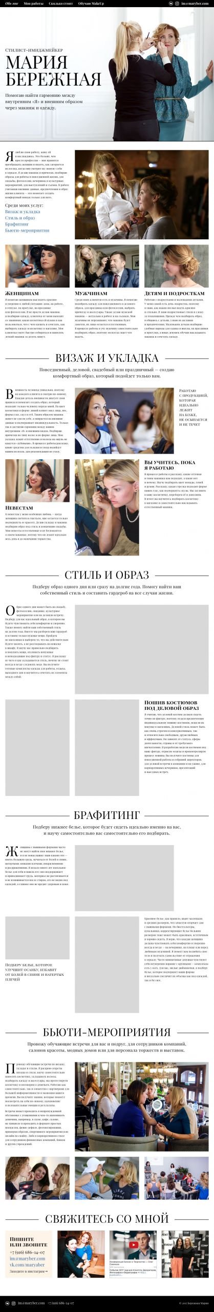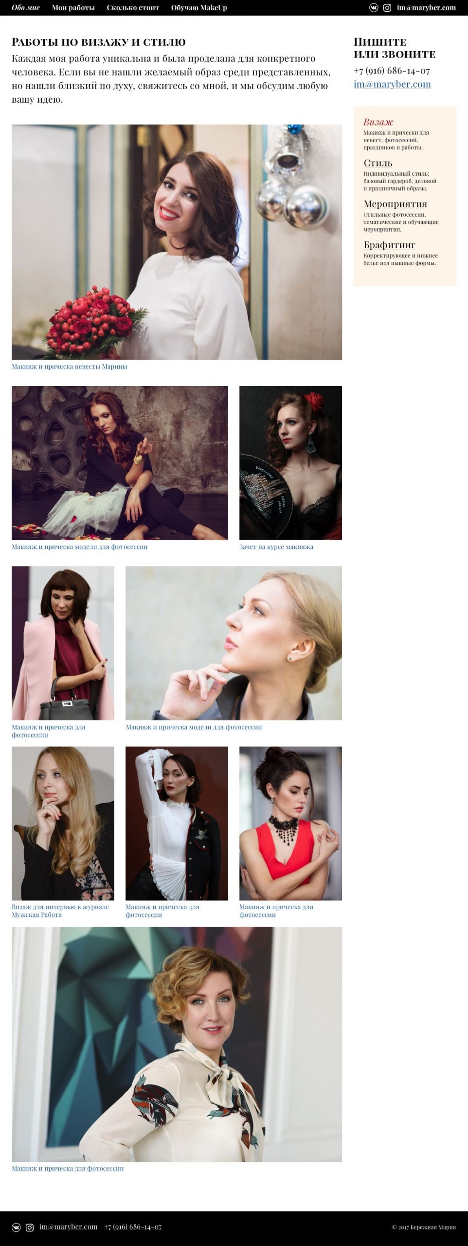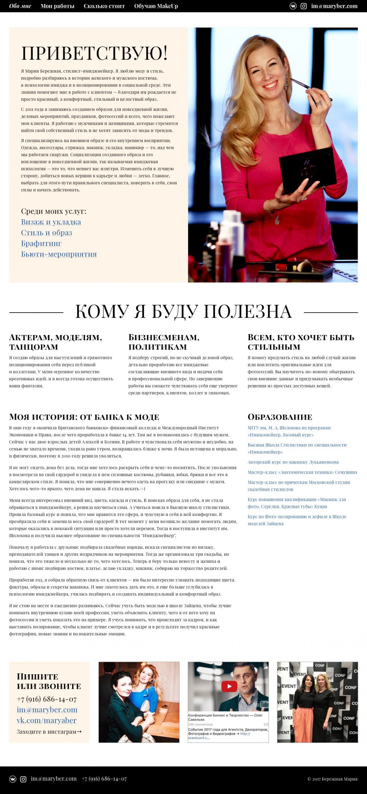 Since Maria’s sphere of activity is connected with the beauty industry, I decided to make the design “like in glossy magazines”. This is how the main page has lettering, and the design of individual blocks resembles a printed layout.