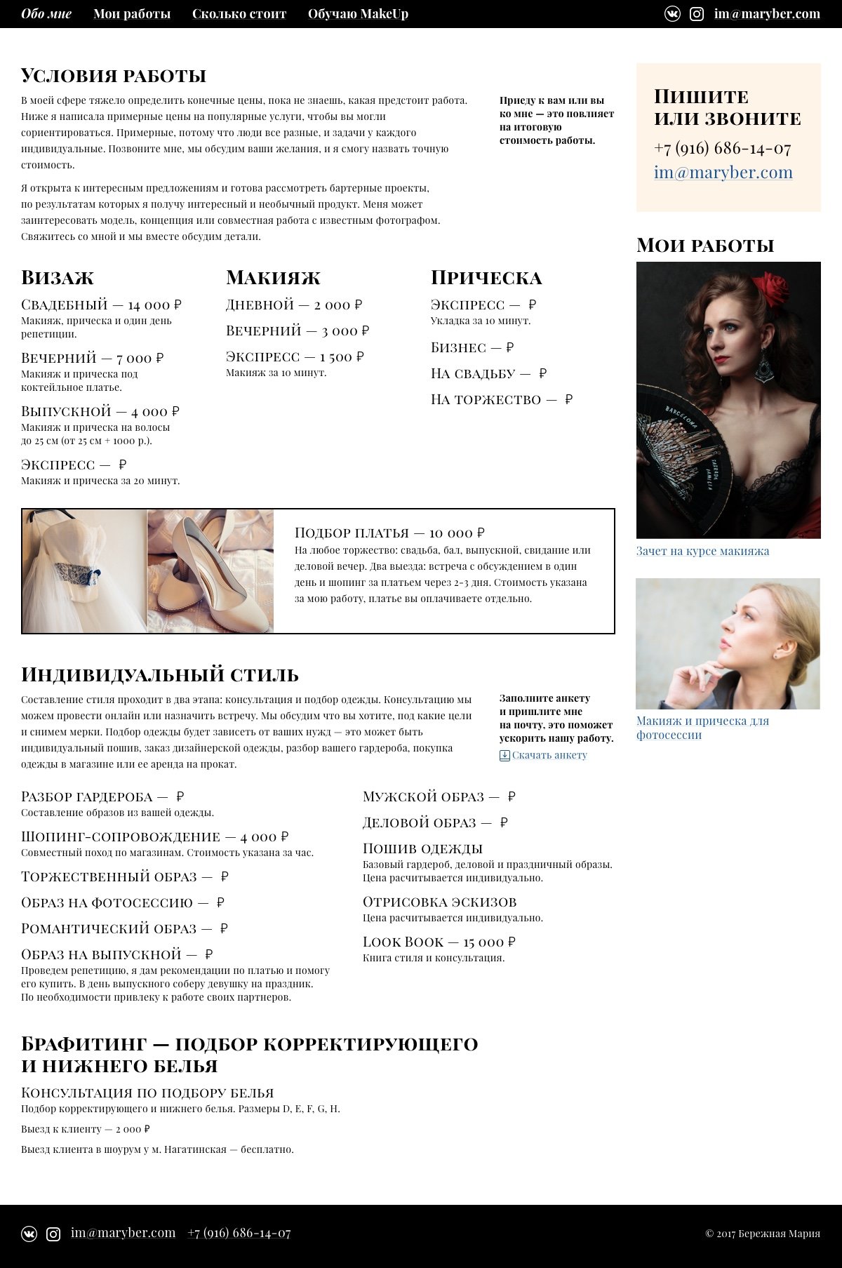 I decided to make the pages with prices and services with a free layout because Maria’s services often change and it’s impossible to fit them into a template.