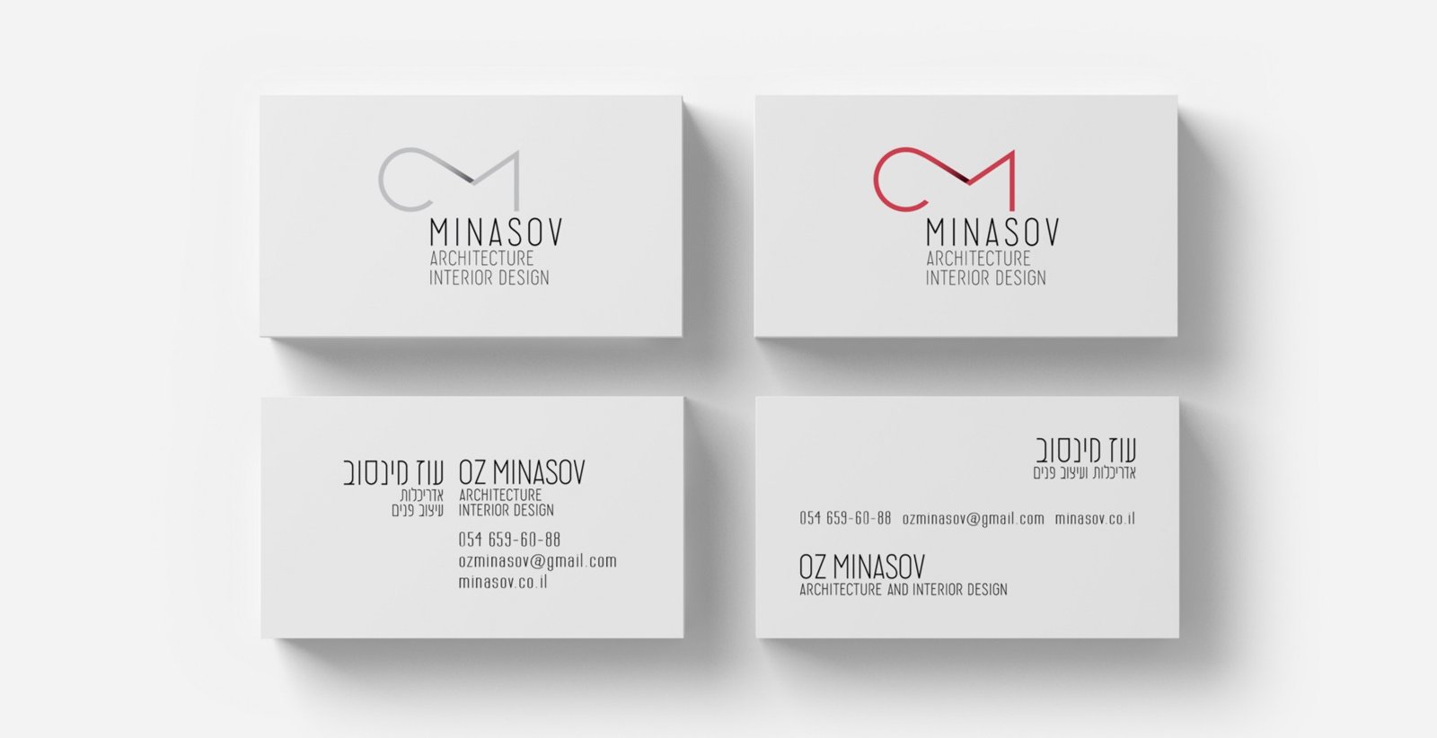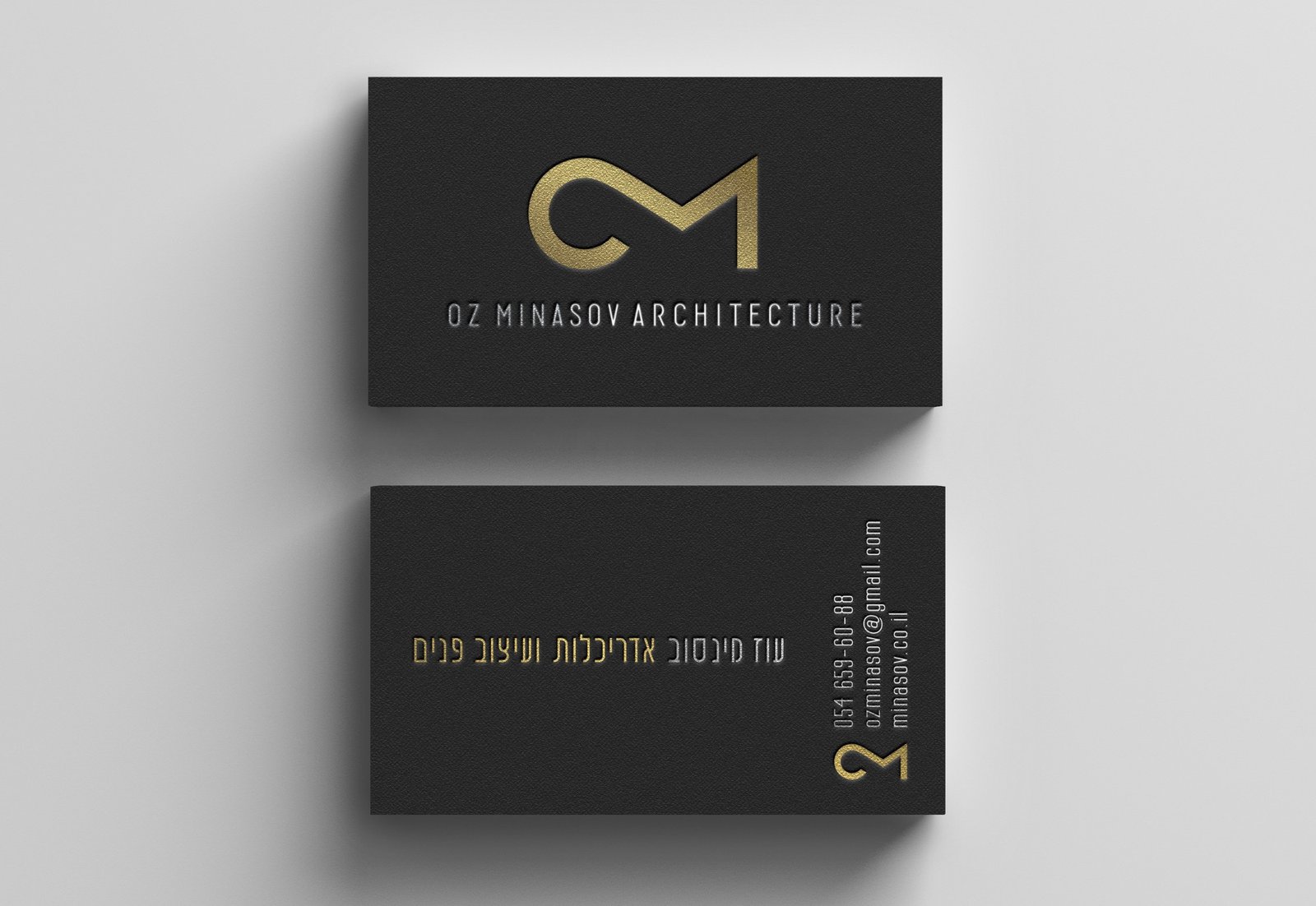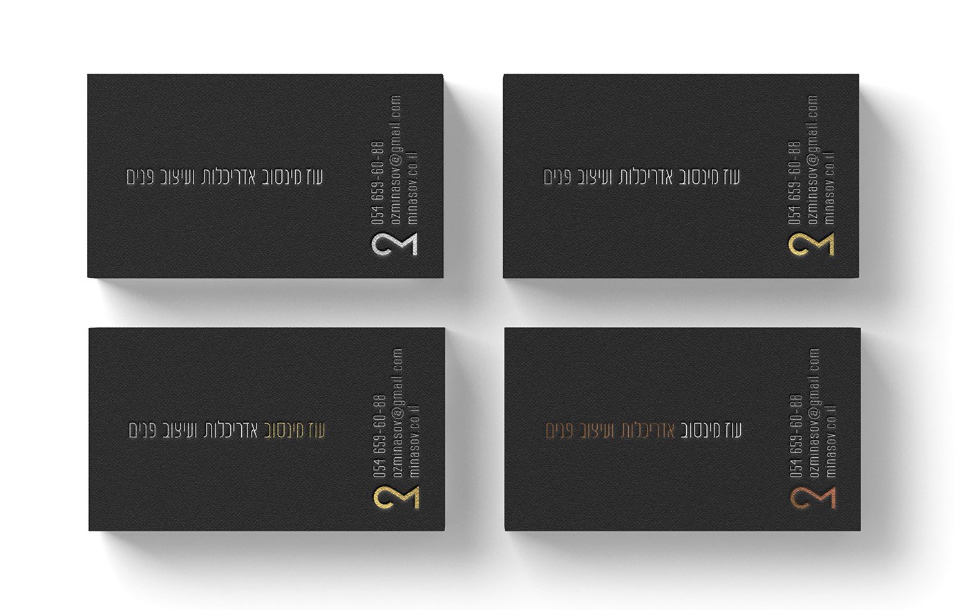 When the sign was ready, I began work on Oz’s business card. For it, I developed a text part in Hebrew to match the style of English writing.