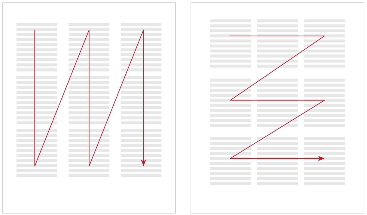 If the text is typed in two columns, we will start reading from the left column (or right column in Hebrew) from top to bottom, and continue at the top of the second column.