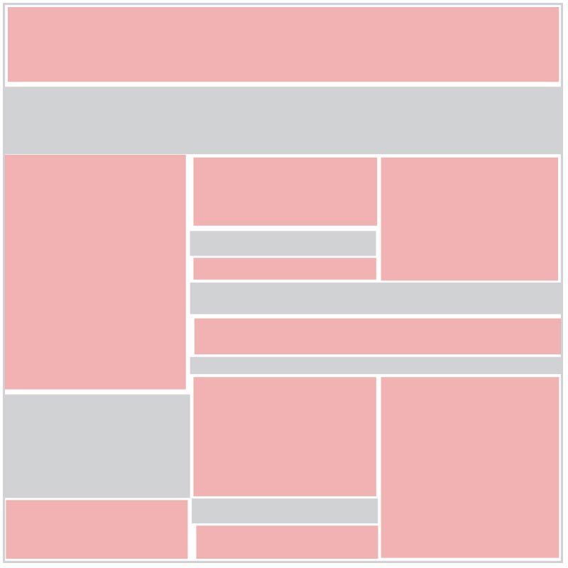 As a rule, all layouts are built according to the “sandwich” principle, i.e. rectangular modules are arranged on floors one after another. Designers like to separate the floors by background colour, but this technique is dangerous, especially if the objects within the floor are equivalent and follow symmetry: