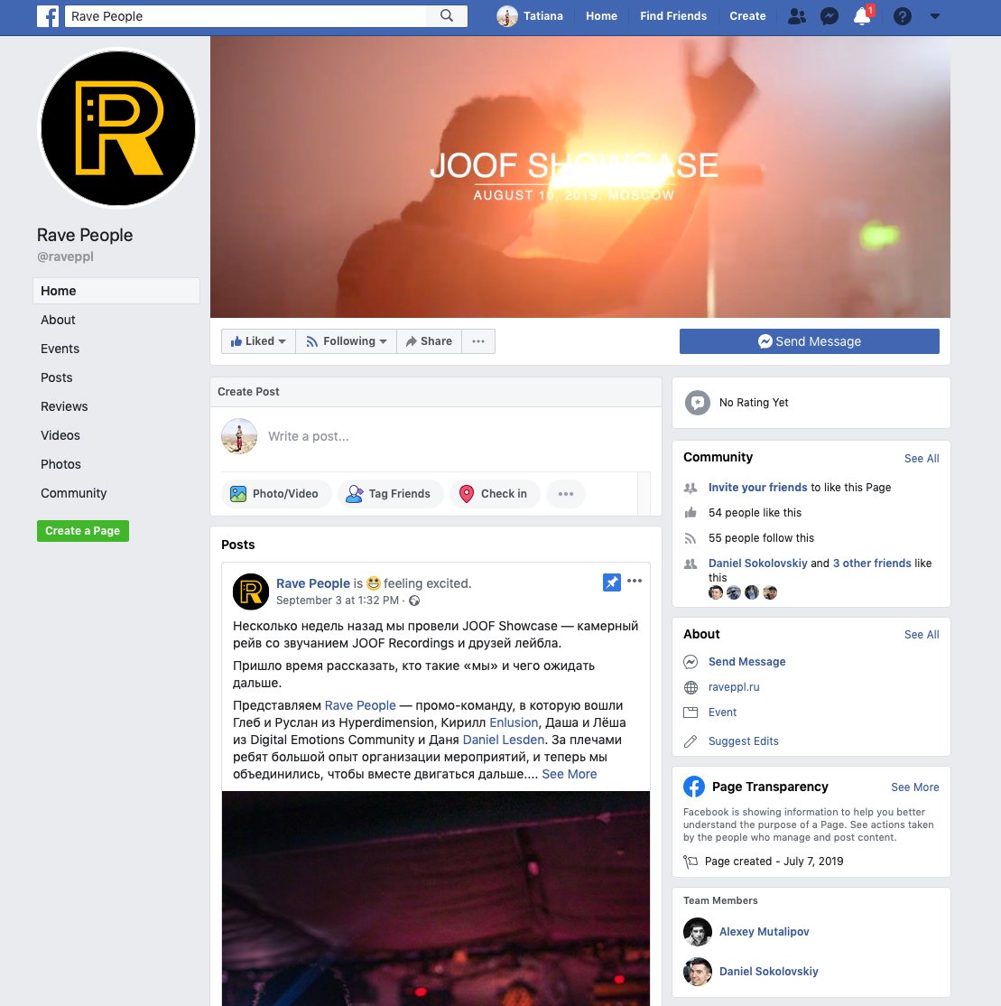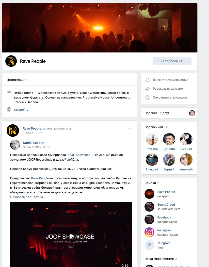 Rave People is a Moscow promo brand. Makes underground raves in chamber format. Main directions: Progressive House, Underground Trance and Techno.
